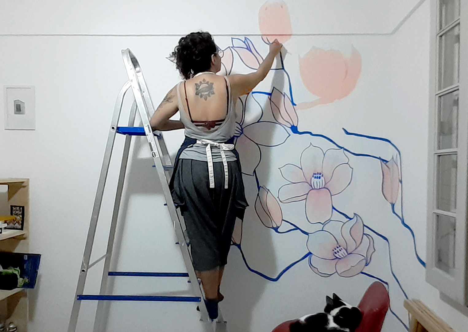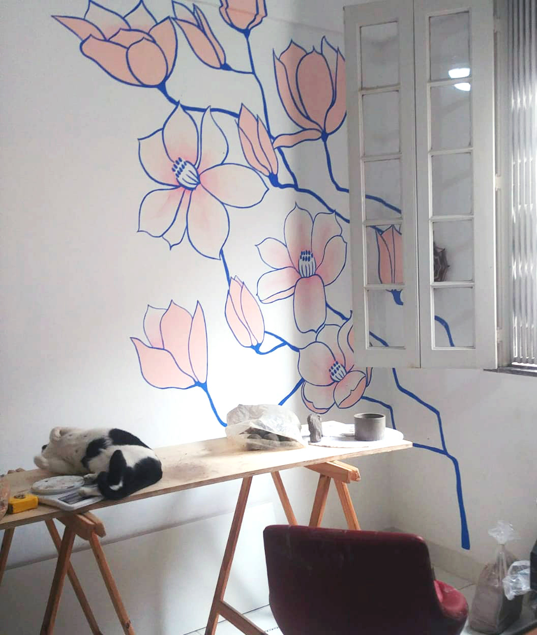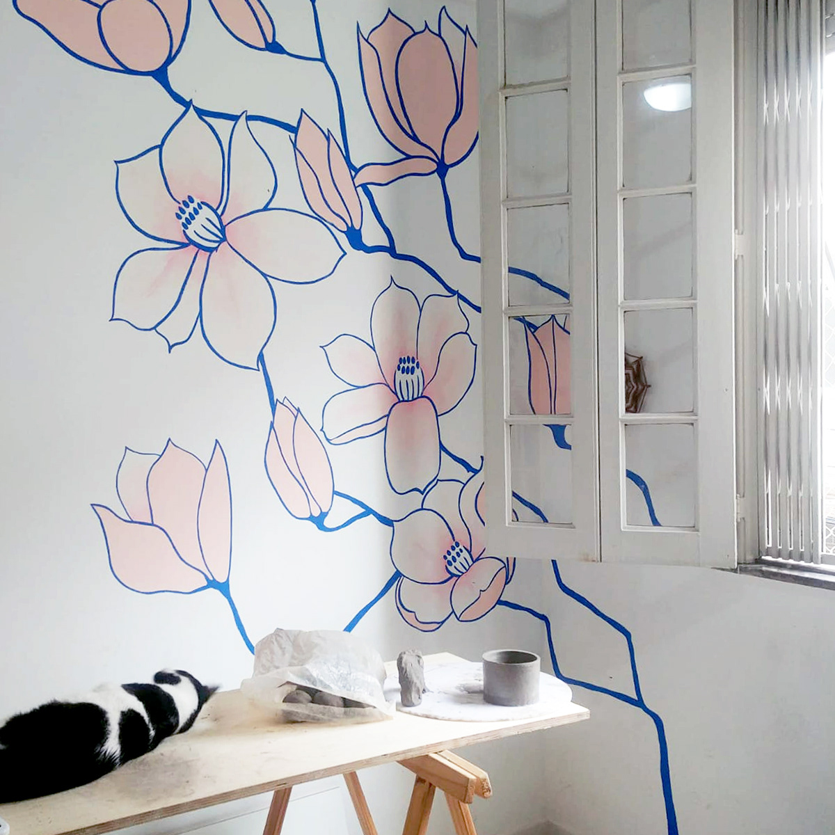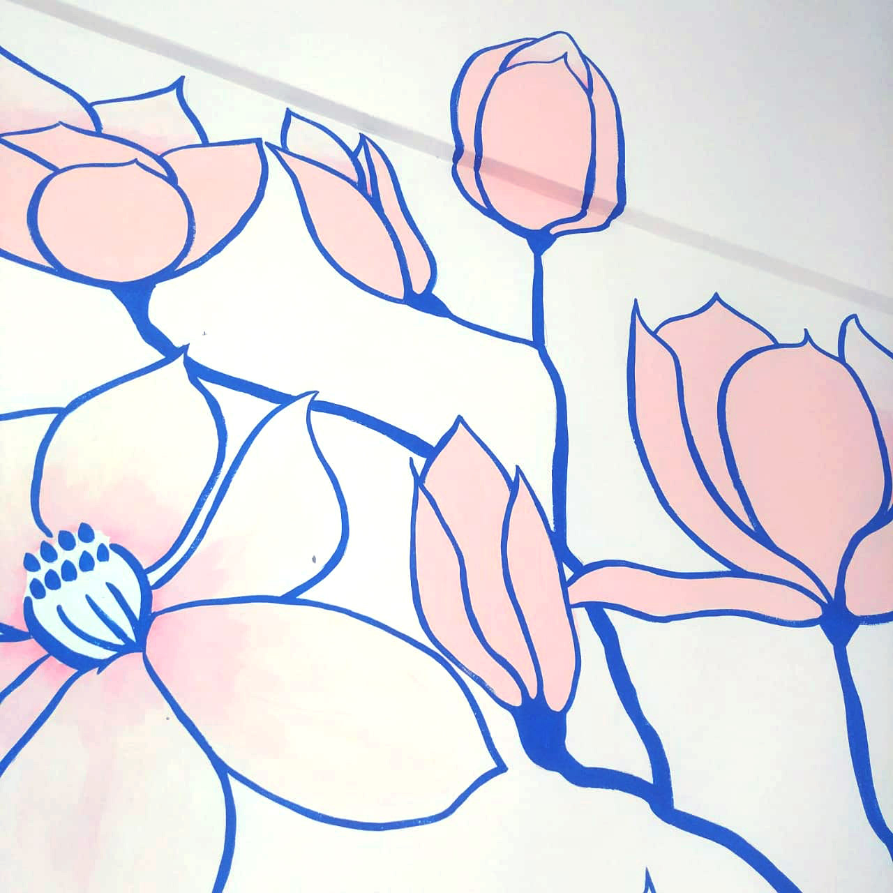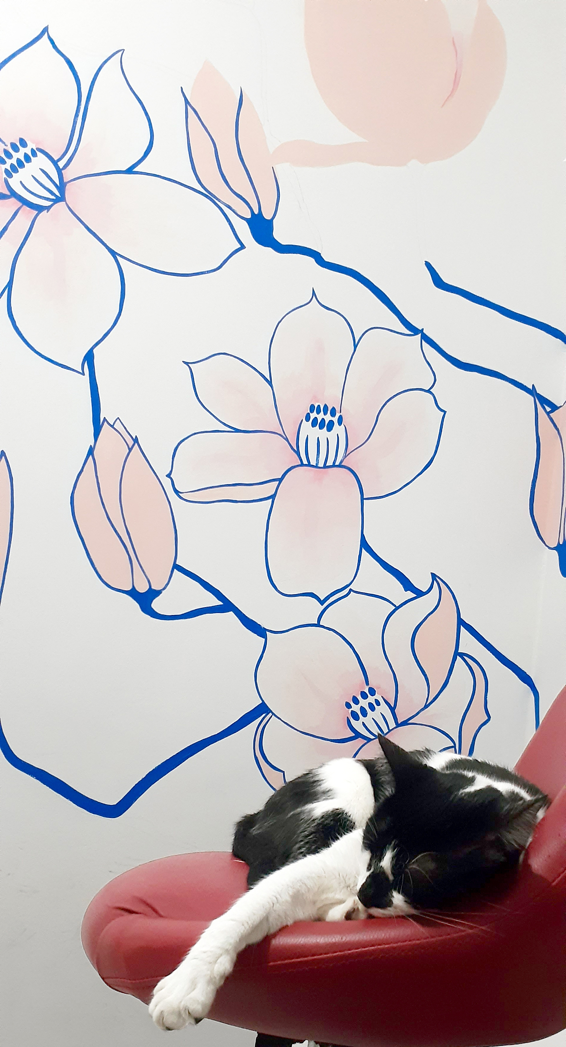 Mural done indoors, by freehand, with magnolias blossoming across the wall and going up to the ceiling.
